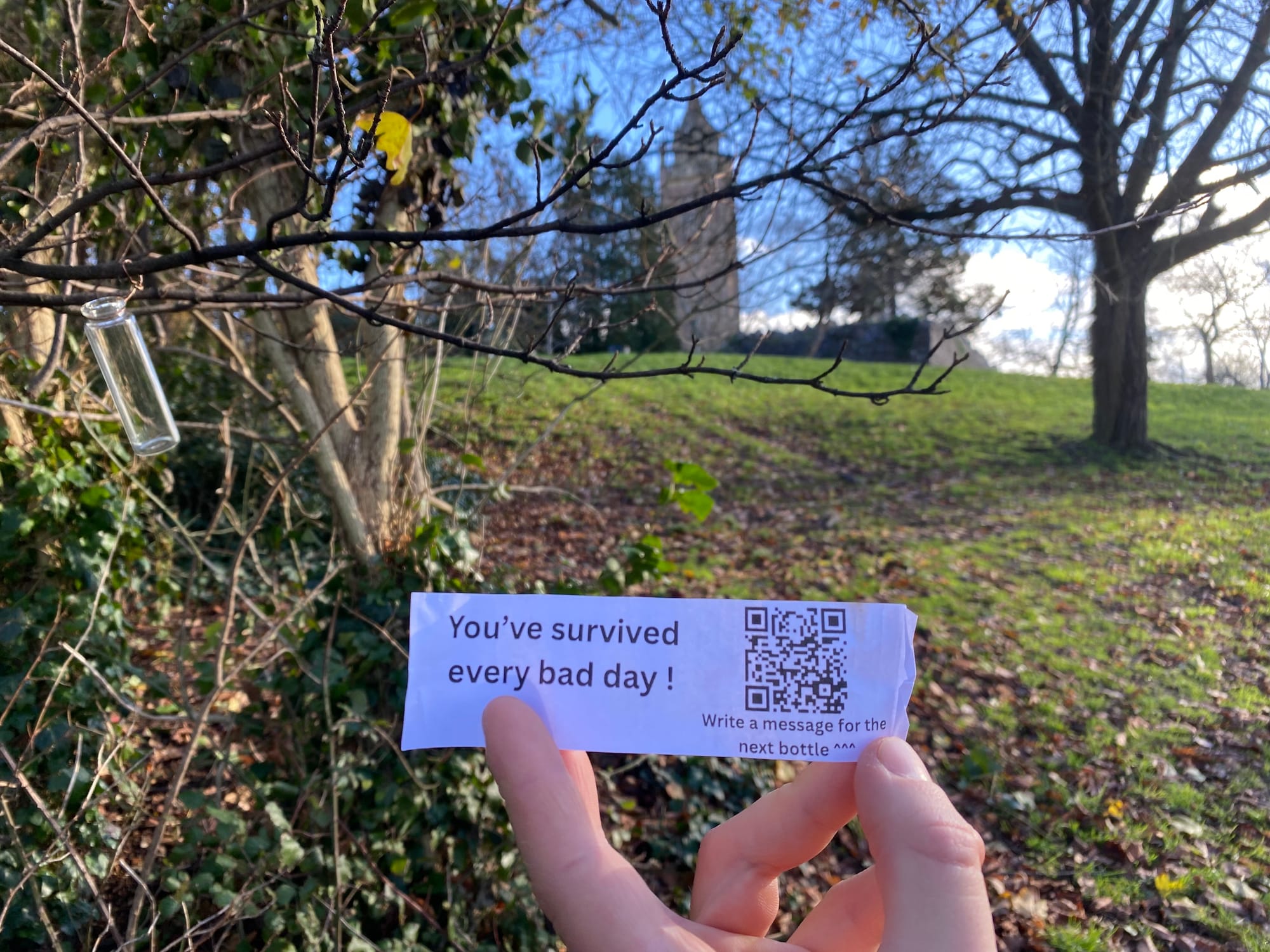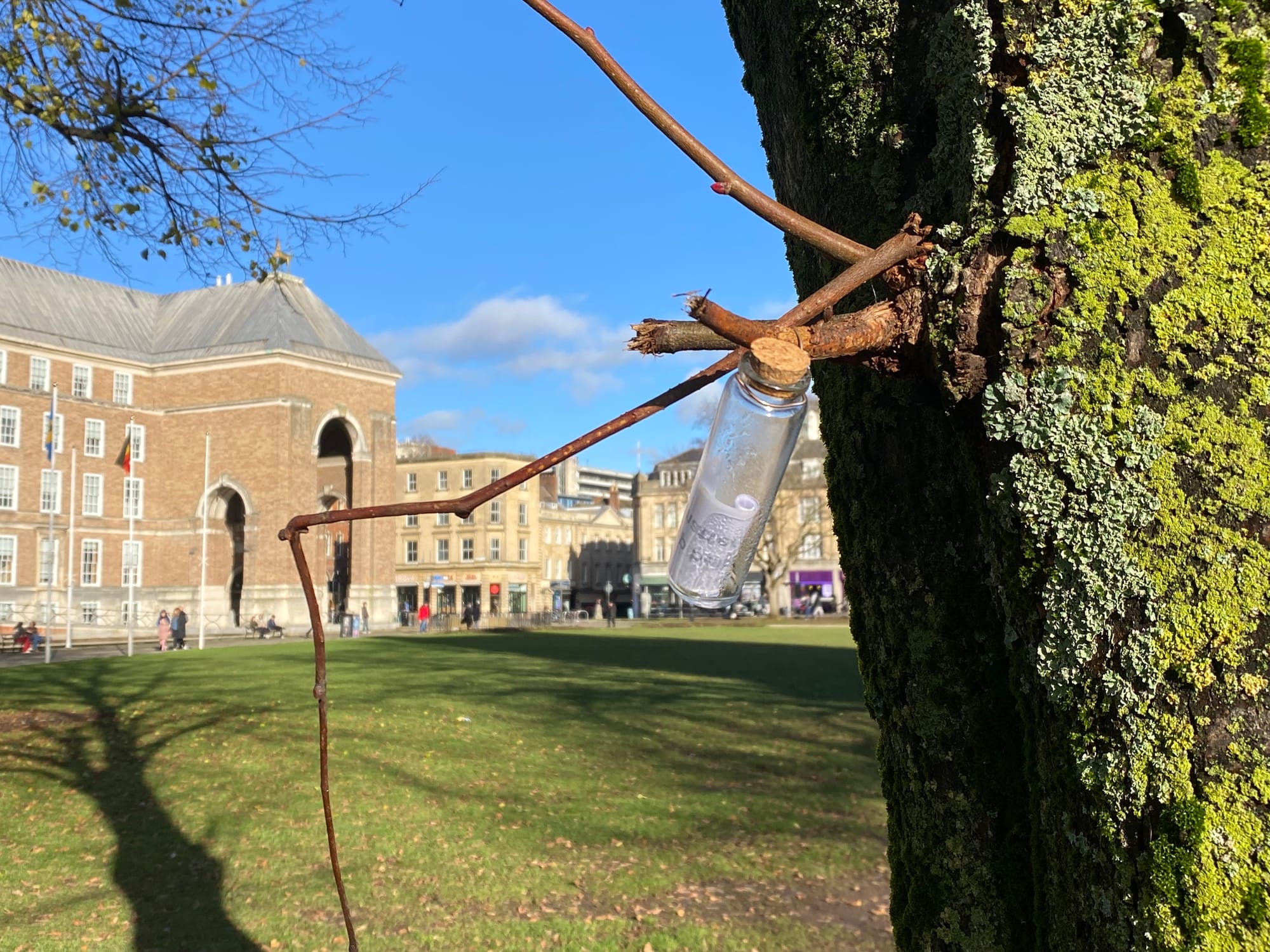 Bristol walkers have been discovering an unusual and uplifting sight over the past few weeks: small glass bottles tied to trees and benches, each containing a handwritten, positive message.