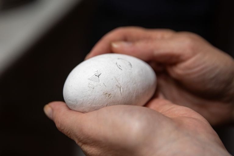 During incubation, the adult flamingos are provided with dummy eggs so they can continue their natural parenting behaviours without disruption. Once the chicks begin to break through the eggshell they are returned to the nests.