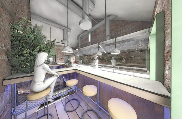 The visuals also reveal exposed ceiling services, hanging feature lighting and greenery throughout. A central staircase connects both levels, allowing diners to look down into the main space below.