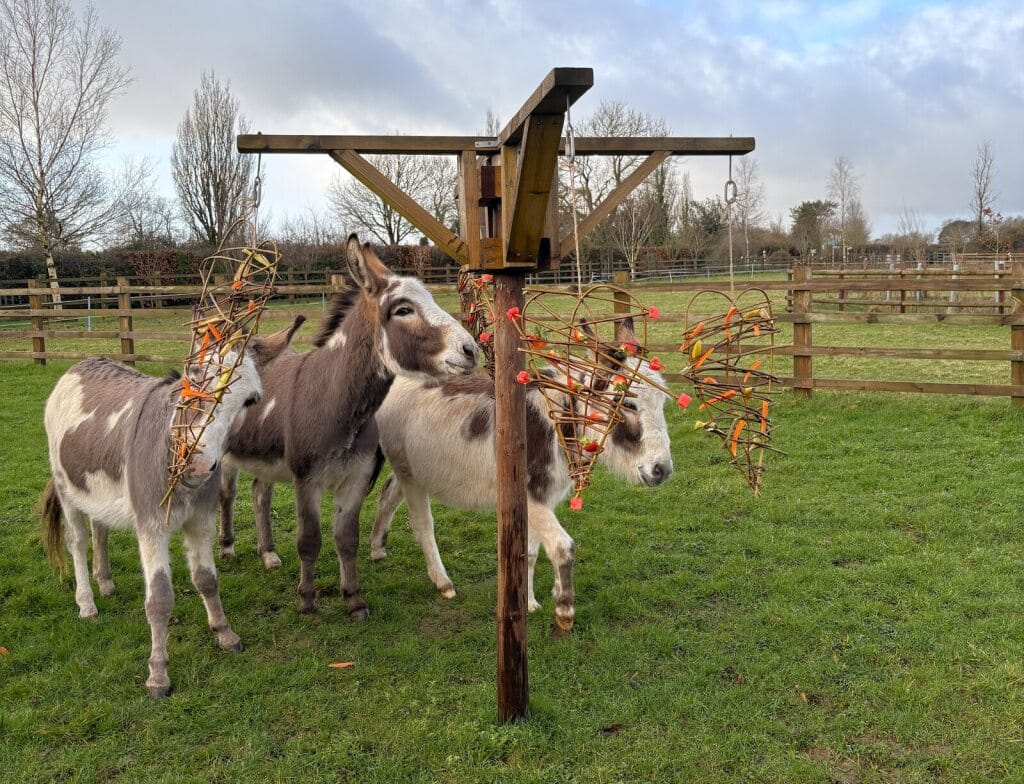 Sculpted willow hearts were packed with strawberries, carrots, bananas and watermelon, giving the donkeys a safe and healthy way to celebrate the season of love.