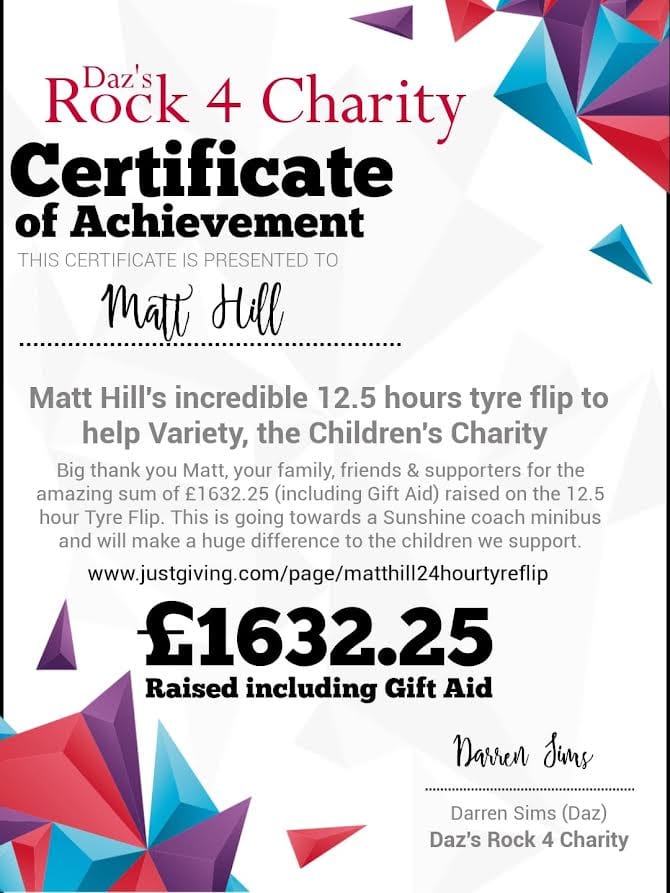 Matt Hill has accomplished an extraordinary 12.5-hour tyre-flip challenge, raising £1,632.25 for Variety, a local children’s charity.