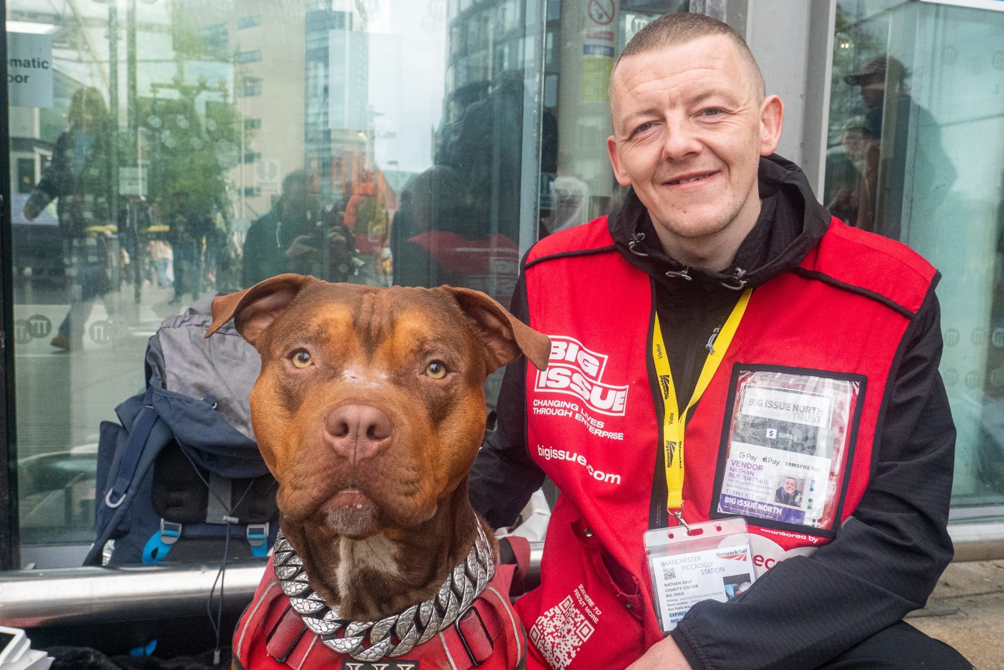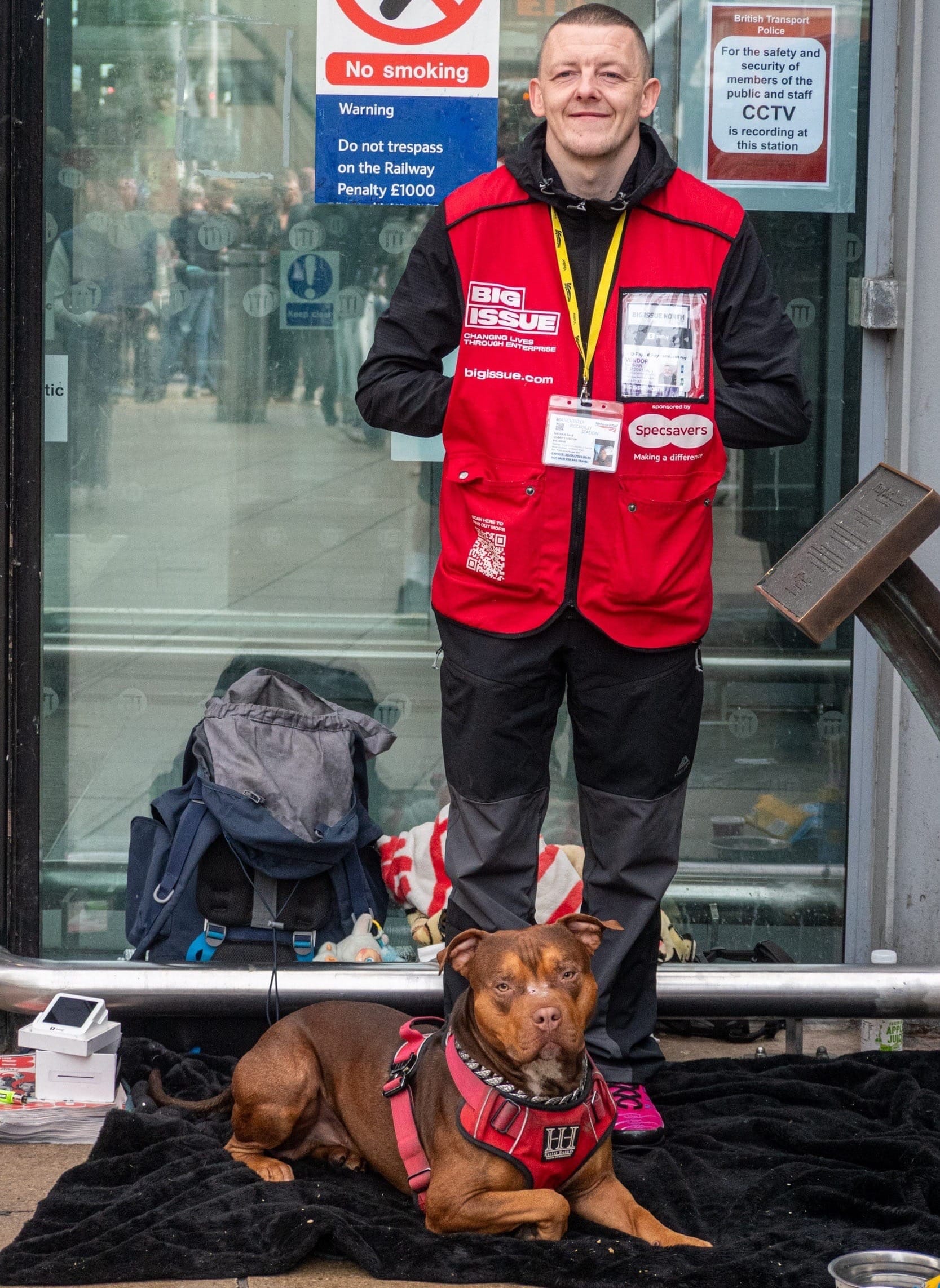 Nathan and Rolo sell the magazine outside Manchester Picadilly station. A familiar sight to commuters, the pair share a close bond – something Nathan credits with helping him to keep focused on the future: