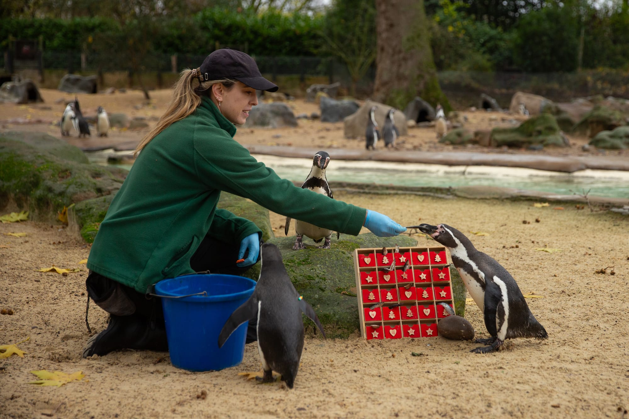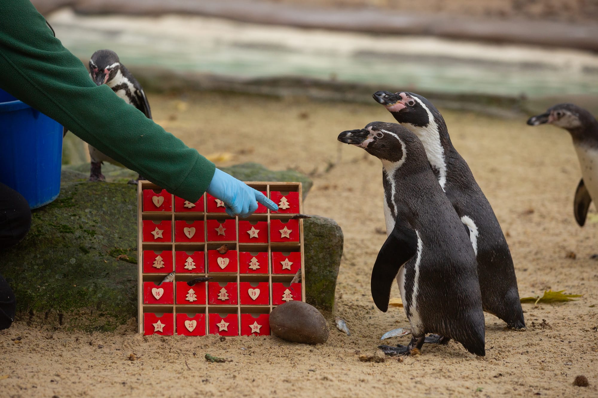 Curious Humboldt penguins (Spheniscus humboldti) waddled over for a closer look as they inspected a specially made advent calendar, packed with fishy festive treats, at London Zoo’s Penguin Beach.