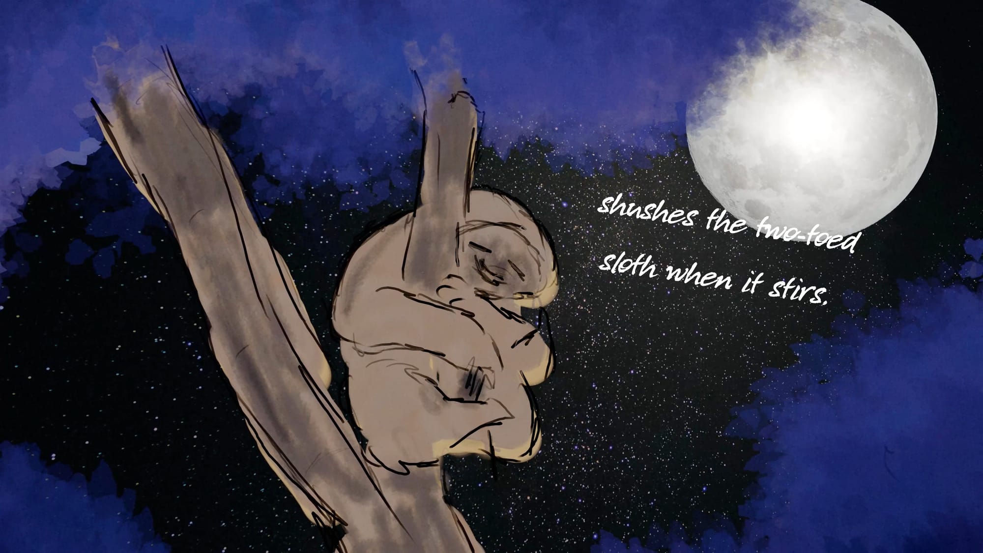 In the poem, the moon is described moving through the zoo after dark, watching over animals in quiet moments of care and attention. It ends with dawn breaking and a reminder of humanity’s role in protecting the natural world.