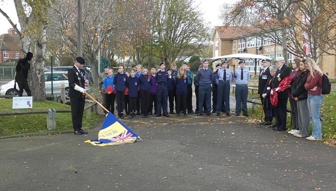 Representatives from a wide range of youth organisations stood together, including Scouts, Badgers, Sea Cadets, Army Cadets, Air Cadets, Girlguides, Prefects, and Head Students.