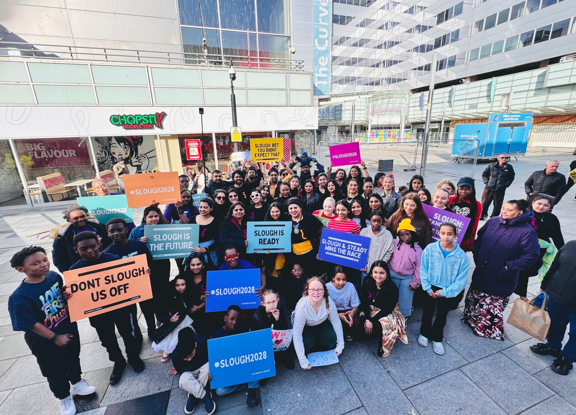 Around 40 performers aged 6 to 22 took part, capturing attention with lively routines and handmade signs reading “We Love Slough” and “We Support Town of Culture 2028.”